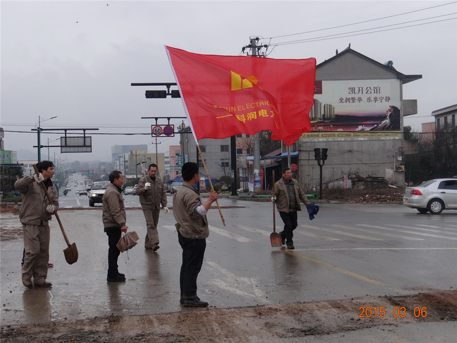 2015年3月6日上午,科潤電力科技股份有限公司黨支部、工會(huì)、婦聯(lián)、共青團(tuán)組織相關(guān)人員,舉行迎三八節(jié)學(xué)雷鋒義務(wù)修路活動(dòng),對江山經(jīng)濟(jì)開發(fā)區(qū)山海協(xié)作園區(qū)的創(chuàng)業(yè)路、協(xié)作路交叉路口的部分坑洼路面進(jìn)行修填。