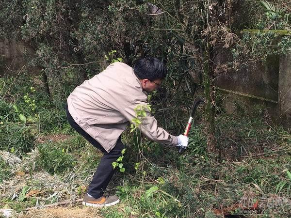 黨員員工 葛其運(yùn):現(xiàn)在我在修剪這個(gè)柏樹的樹枝,這也是我們烈士墓邊上多年沒有修過的。