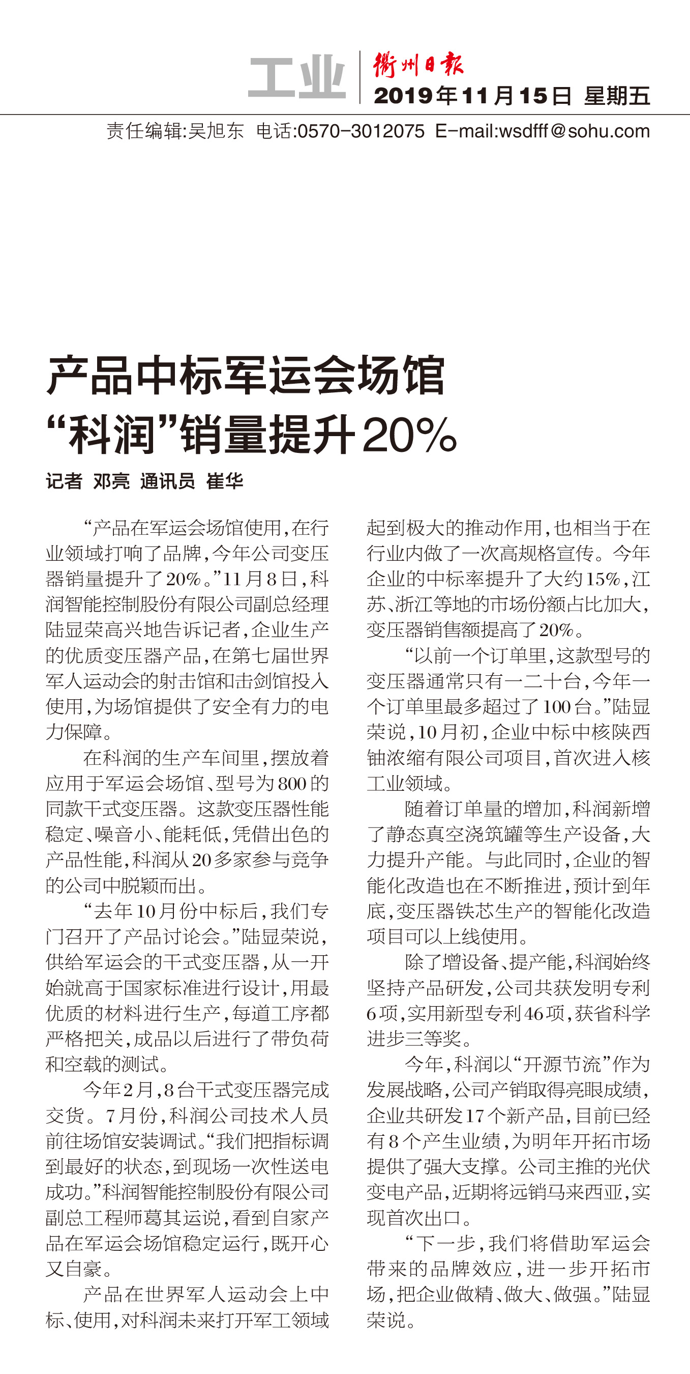 衢州日報上關(guān)于"產(chǎn)品中標(biāo)軍運(yùn)會場館 “科潤”銷量提升20%"的報道