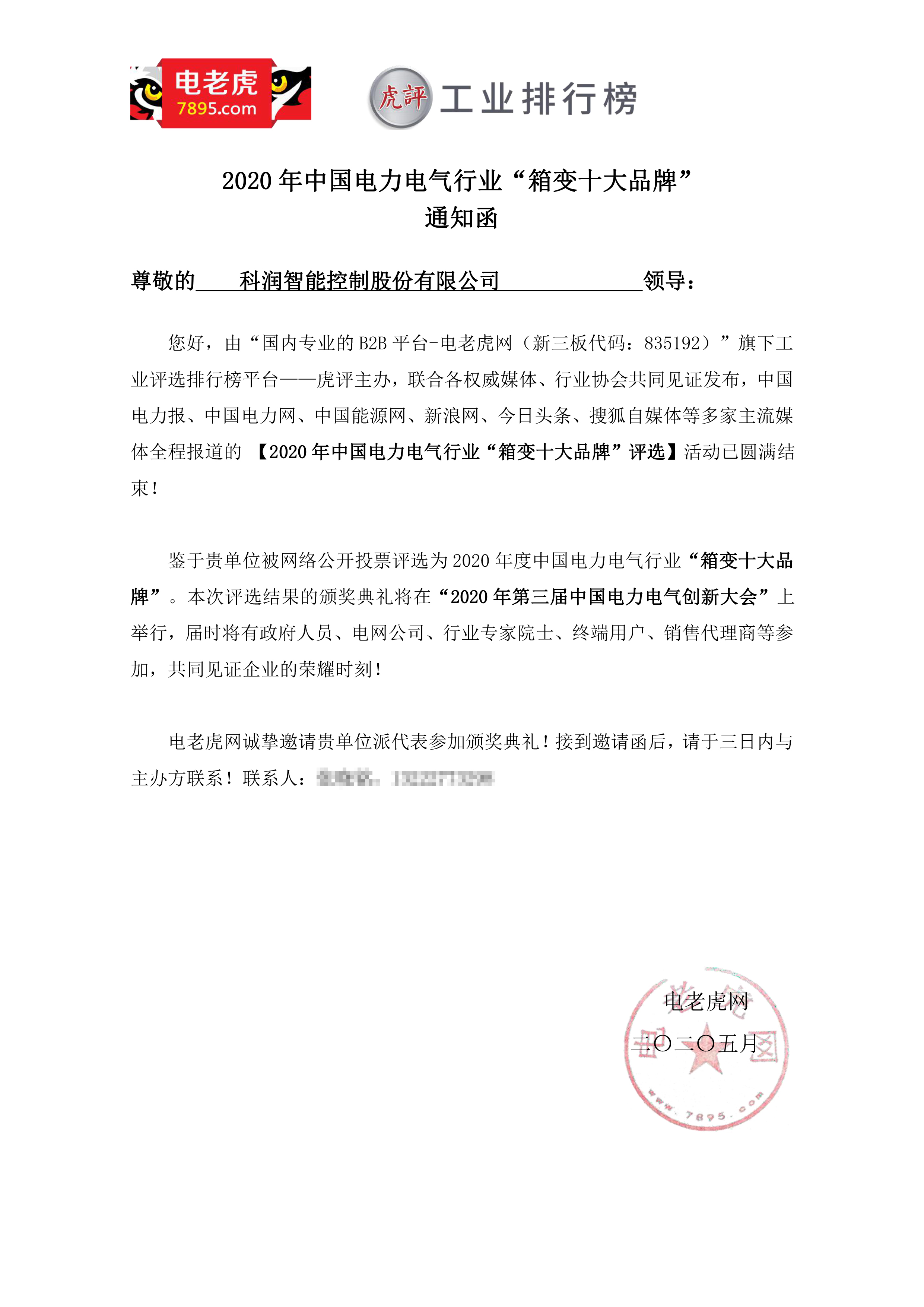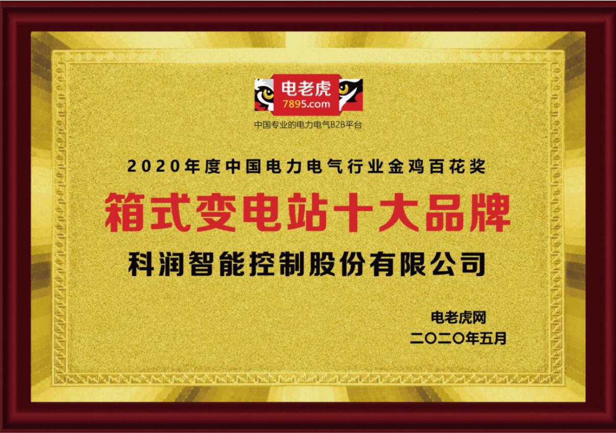 我公司在參選的91家企業中脫穎而出,入圍前十名,被評選為2020年度中國電力電氣行業“箱變十大品牌”。